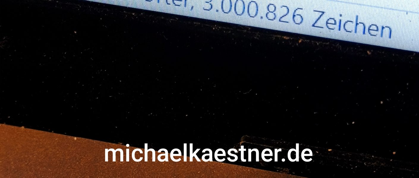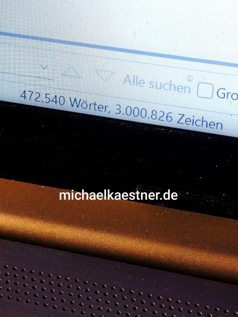 Trotzdem arbeite ich an einem Werk, wie ich es nie wieder schreiben werde. Nichts Besonderes vielleicht oder doch? Jedenfalls bringe ich es irgendwie in den Arbeits- und Sonstalltag unter und schreibe immer mal meine paar Zeilen pro Tag. Die Geschichte, um die es geht und um die ich hier noch ein gewisses Gehemnis mache, erzählt sich in meinem Kopf weiter. Eine Grundidee steht, doch meine Figuren nehmen, wie ich manchmal im wahren Leben, Umwege in Kauf, um Abenteuer zu erleben. Gestern habe ich einen weiteren Meilenstein erreicht. Ich weiß schon, Qualität und Quantität (Menge) sind zweierlei. Dennoch zeigt es mir, dass ich drangeblieben bin. Nun habe ich tatsächlich trotz des vielen Löschens und wieder Herausnehmens das dreimillionste Zeichen erreicht! Alle mit den Fingern eingetippt. Bisher über 470 000 Wörter. Bald schon habe ich die 700. Arbeitsseite erreicht! In Taschenbuchform wären es viel mehr Seiten. Wenn ich sagen kann, „fertig“, werde ich alles aber noch einmal durchgehen und lektorieren.
