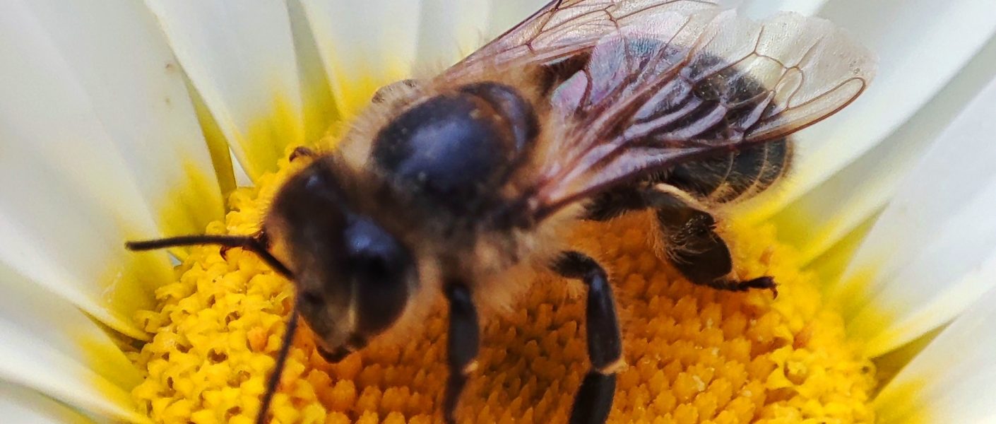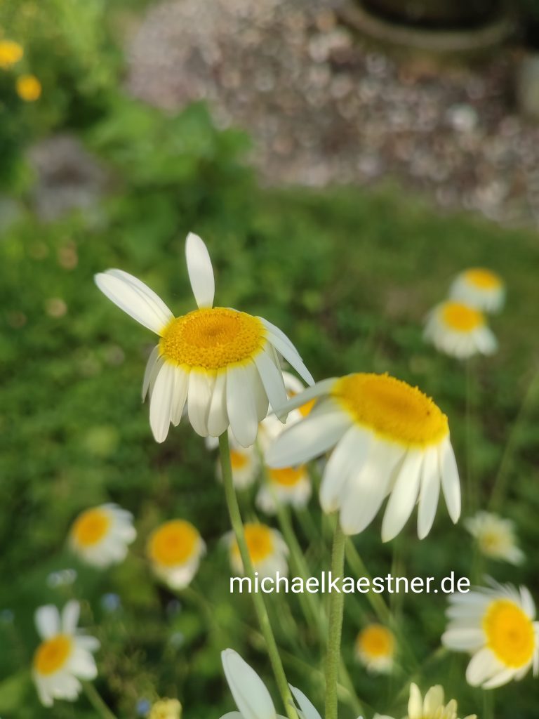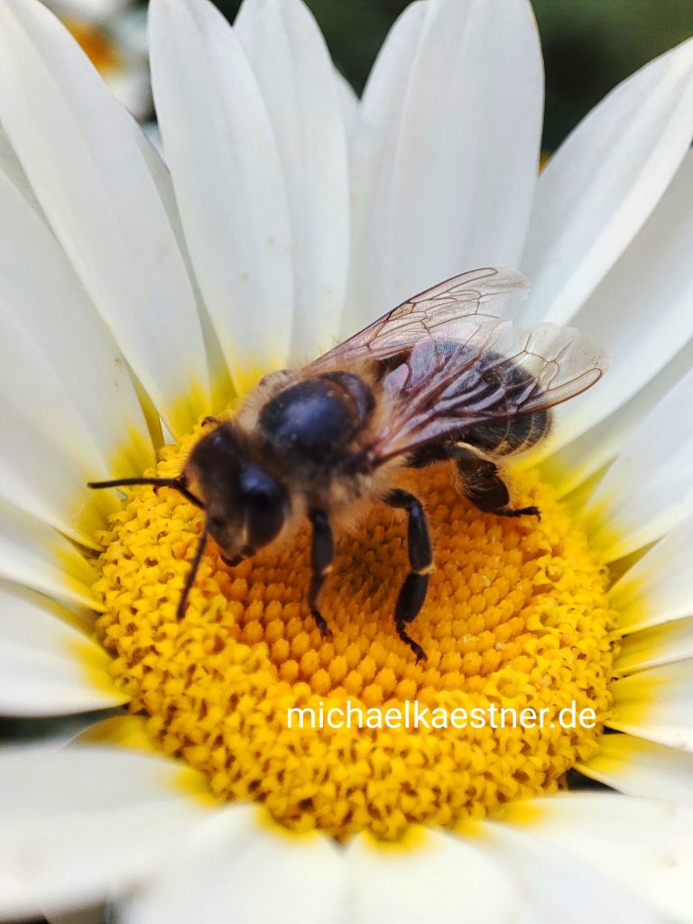 Natürlich schaute ob dieser zauberhaften Aussichten auch Frau Biene vorbei. Sie interessierte sich allerdings mehr für die reizende Madame Kamille. Du hättest sehen sollen, wie wunderbar ihr das weiße Kleid stand und wie einladend sie ihr Dekoltee präentierten. Da konnte Frau Biene nicht „Nein“ sagen und es geschah, was in so vielen Gärten, auf so vielen Feldern geschieht, wo die Riesen noch Blumen gelassen hatten: Frau Biene und Madame Kamille hatten ein für beide unvergessliches Zusammentreffen. Sie wussten, dass sie beide noch lange von dieser wunderbaren Begegnung zehren würden.