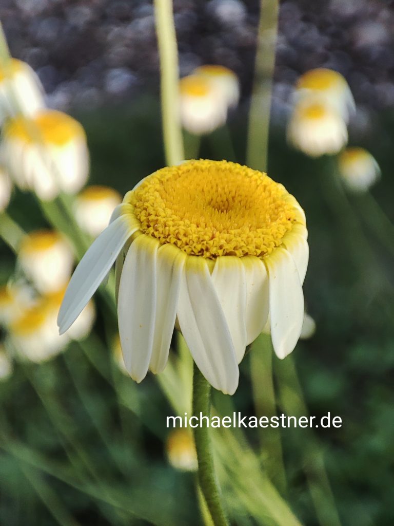 Am Abend dann, als die kleinen Kamillen schon ihre zarten Ärmchen zusammengefaltet hatten, war auch Madame Kamille sehr müde. Sie streckte ihre letzten zwei Ärmchen in den Himmel, auf dass sie aussah wie ein Häschen und erzählte den Anderen von ihrer aufregenden Begegnung. Was genau sie berichtete, das kann ich dir und euch leider nicht erzählen, denn ich war ja einer dieser Riesen mit den klingendem Glas in der Hand. Und bekanntlicherweise haben wir einander jene Sprache vergessen, mit der wir einander verstehen. Wie gut, dass manche von uns solche Hindernisse überwinden können, in dem sie Momente nicht nur mit Augen und Kopf, sondern auch mit dem Herzen erfassen …